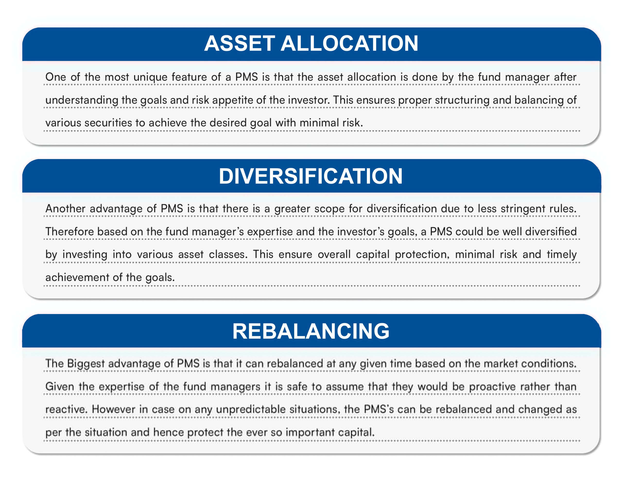 3) PMS make sure that you are relieved from all the administrative hassles from your investments. We also provide periodic reports on the performance and other aspects of your investments.